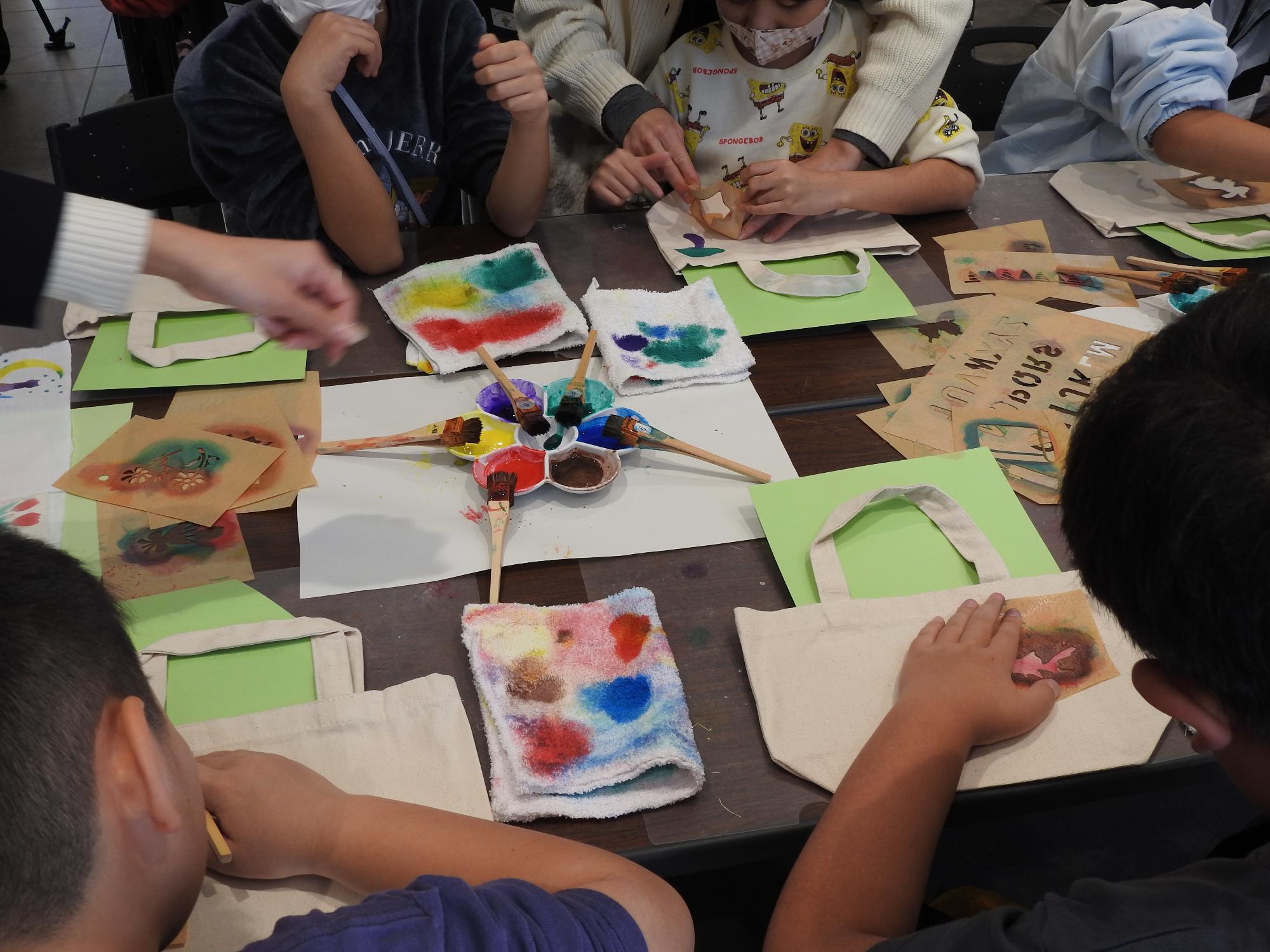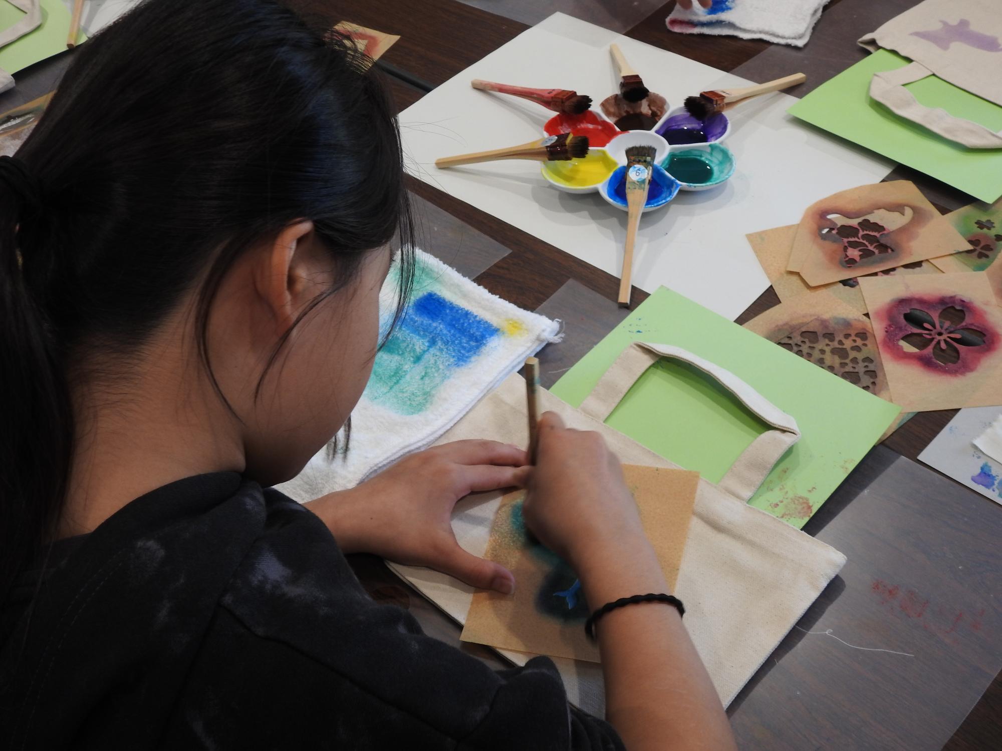 高校生に教えてもらいながら「友禅染め」を体験しました。イルカやてるてるぼうず、桜など様々な型から自分の好きな型を選んで、すてきなトートバッグを作ることができました。