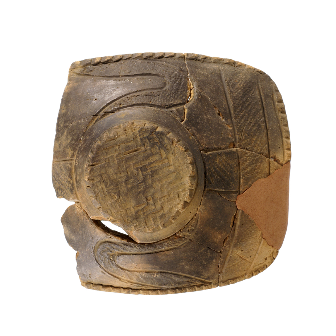 市内縄文遺跡から出土した土器。裏面に敷物(網代)の跡がついている。