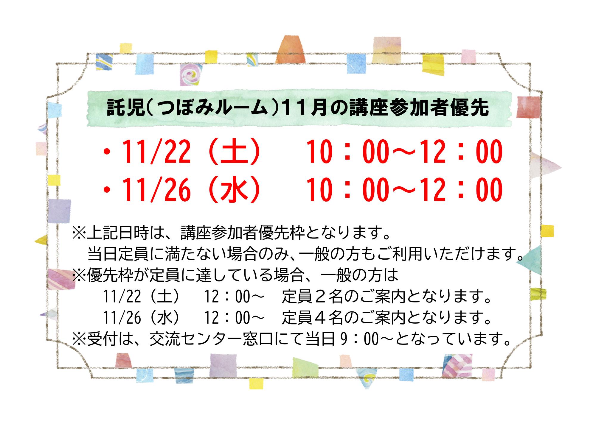 詳しくは、託児(つぼみルーム)ご案内ページをご覧ください。