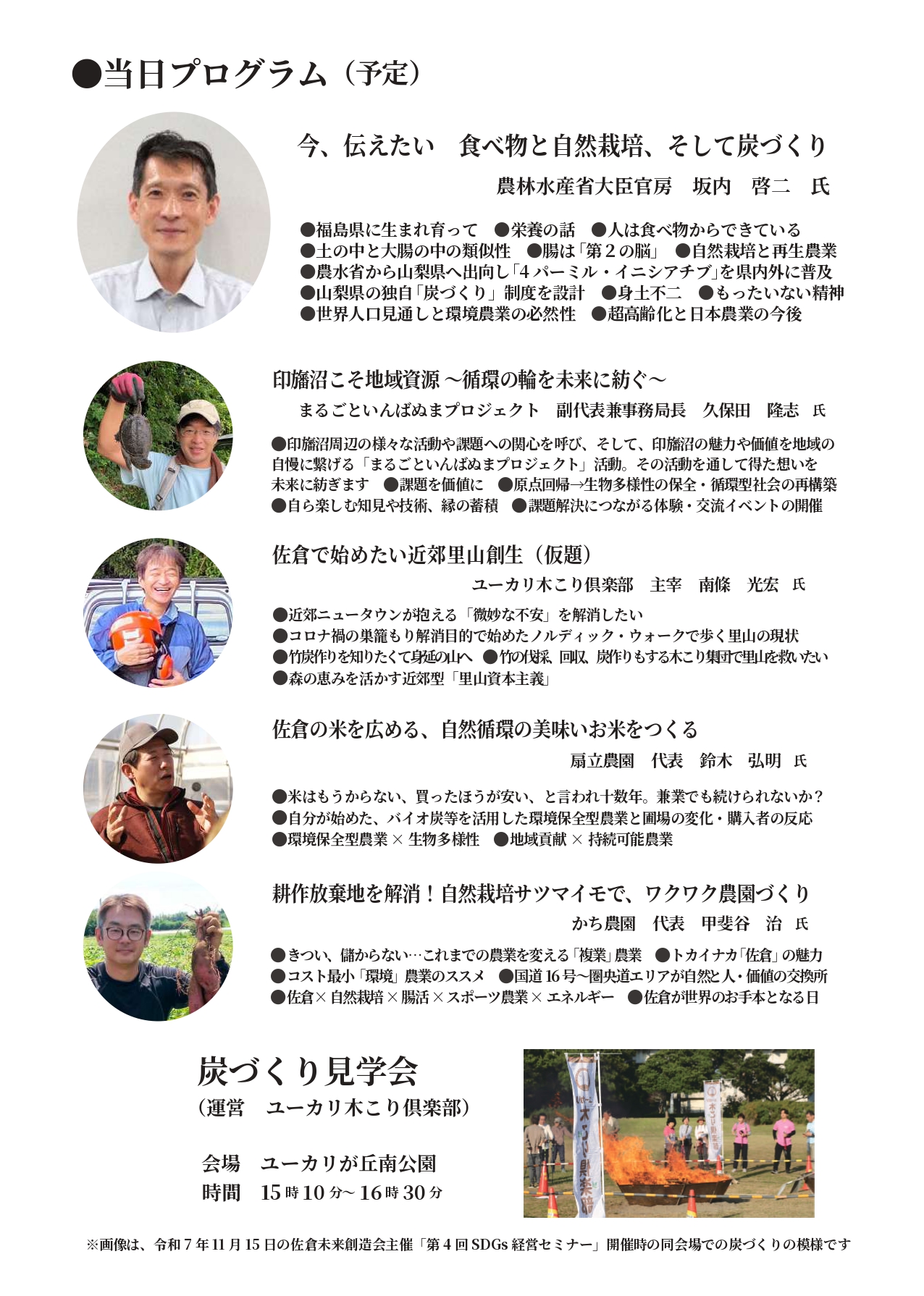 坂内先生の講演と佐倉市内の様々な立場の活動者の講演に加え、実際に炭づくりも見学できる内容となっています。環境の持続可能性について感じたり、学んだりできるプログラムです。ご興味がある方はぜひご参加ください。