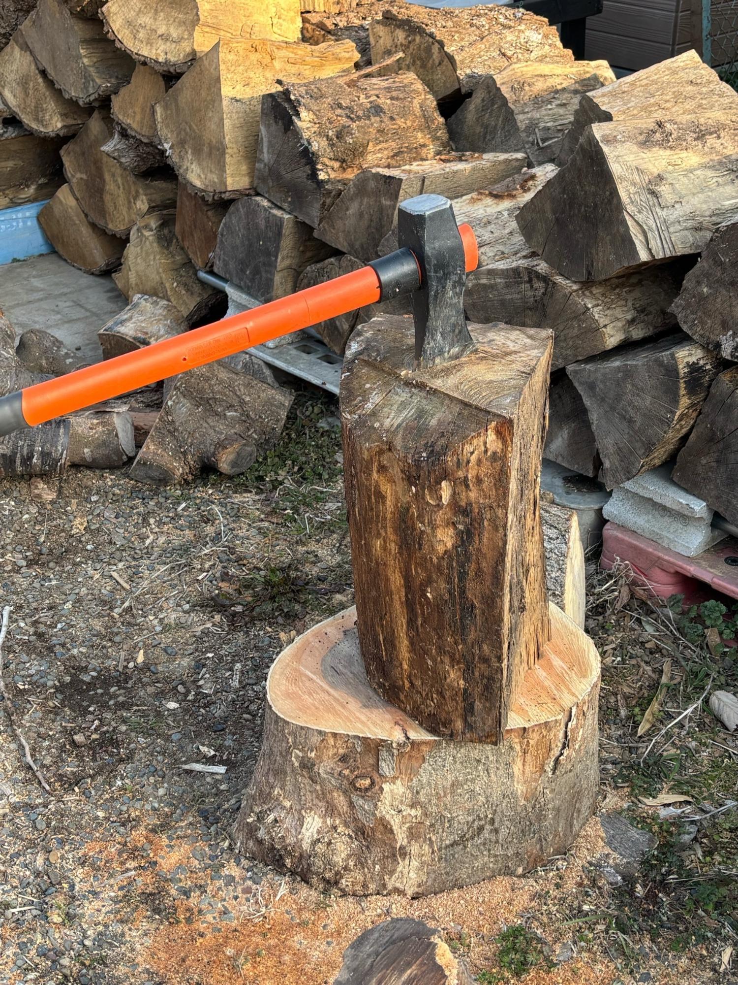 ・大人は難度の高い「樫の木」、子どもは割りやすい「杉の木」の大丸太で薪割体験が楽しめます。