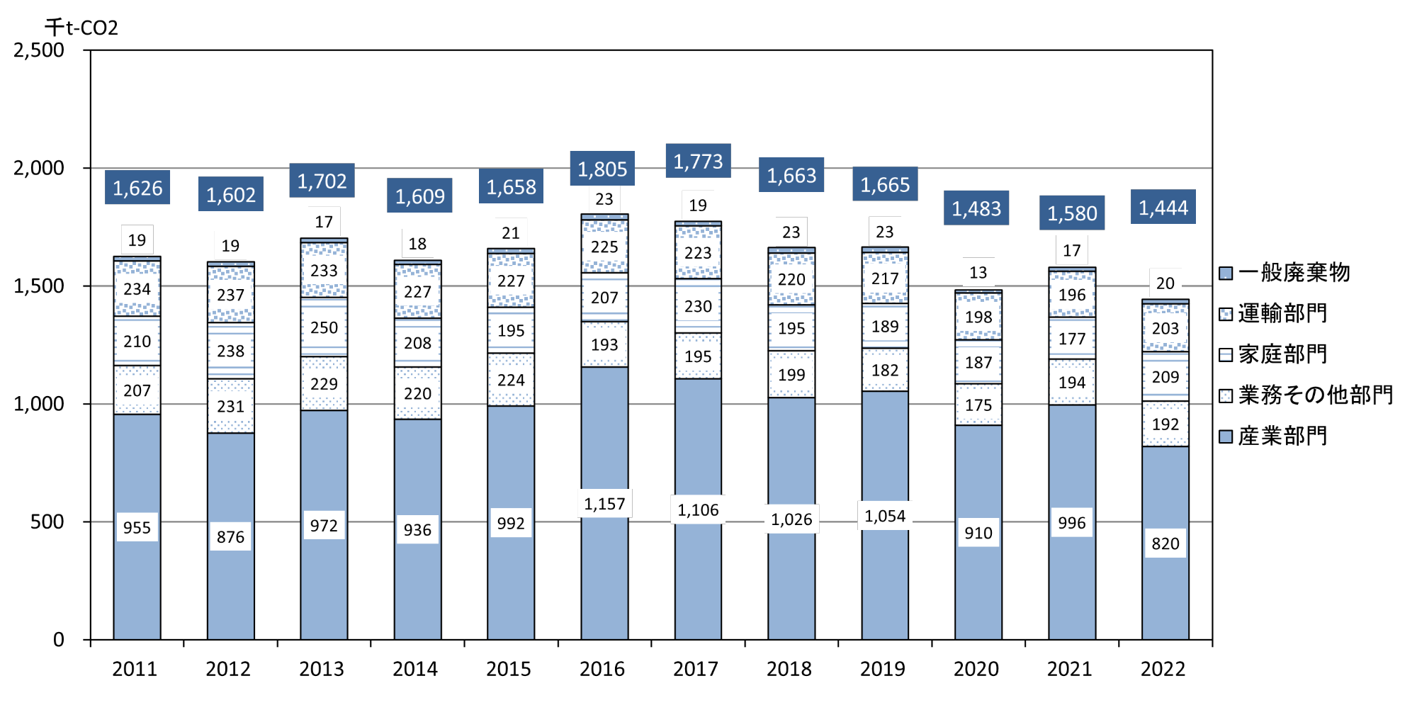 環境省「地方公共団体実行計画(区域施策編)策定・実施マニュアル・ツール類(自治体排出量カルテ)」に基づき把握。