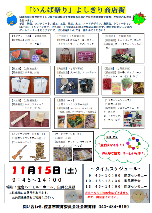 印旛特別支援学校さくら分校と印旛特別支援学校高等部の生徒が作業学習で作製した製品の販売会を行います。