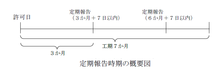 定期報告が必要となる工事の場合、開発許可年月日から3か月ごとにその末日から7日以内を期限とし、定期報告書、工事を行っている土地の写真及び進捗が確認できる図面等を提出する必要があります。